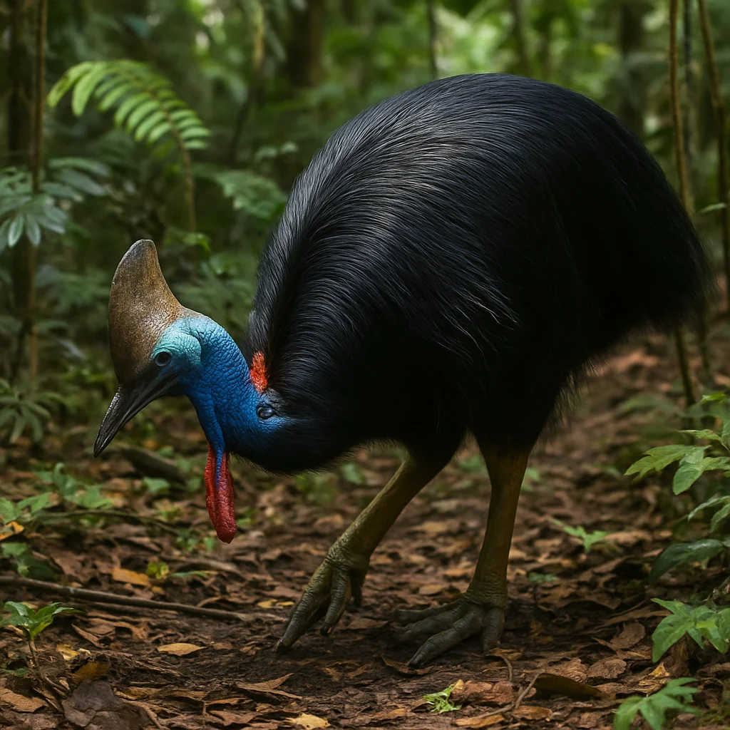 Cassowaries are unique and powerful flightless birds native to lush rainforests. Known for their brilliant blue necks, herculean legs, and majestic casques, they play a vital role in their ecosystem while inspiring awe for their speed and strength.